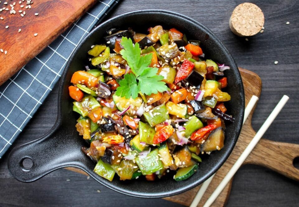 Keptuvėje kepamas daržoves sojos padaže paruošti labai paprasta ir greita. Galite naudoti bet ką, ką turite šaldytuve, įskaitant šaldytus produktus. Imbieras, gervuogės ir sojų padažas išvirtam padažui suteikia nuostabių pikantiškų natų.