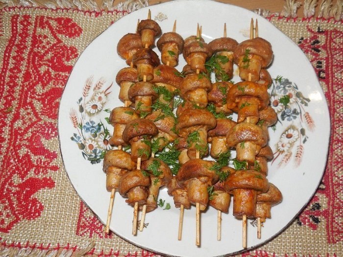 Grybus galite tiesiog paruošti kaip užkandį, tačiau daug geriau jie atrodo kebabų pavidalu. Patiekalas, kuris patiks šventinio stalo svečiams. O šie grybai tokie kvapnūs.