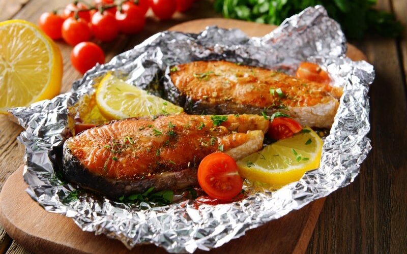 Sutrinkite špinatus ir supjaustykite aitriąją papriką gabaliukais. Jums reikės 4 folijos gabalėlių. Į kiekvieną iš jų įdėkite žuvį. Apšlakstykite aitriųjų paprikų padažu. Ant viršaus pabarstykite špinatais. Foliją uždenkite vokais.