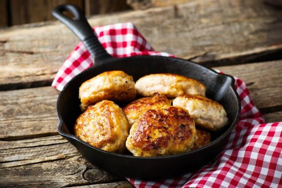 Jalovičina ir kiauliena idealiai dera: paukštiena kotletams išeina labai sūri, kad pasaga nesugestų keptuvėje.