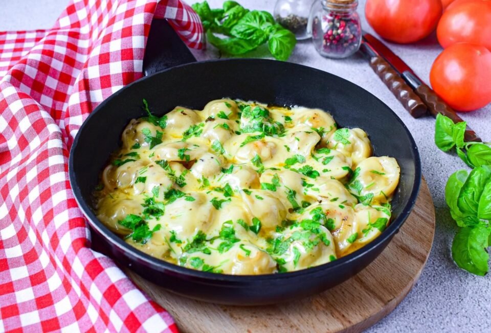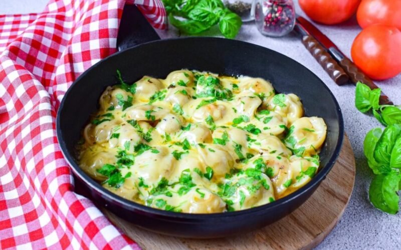 Koldūnai turėtų būti sulipdyti į vieną gumulą. Tepkite vieną pusę 3-5 minutes, tada apverskite į kitą pusę. Įsitikinkite, kad jie nelimpa. Jei reikia, įpilkite daugiau alyvuogių aliejaus. Kai koldūnai apskrunda, supilkite grietinę arba kitą padažą.