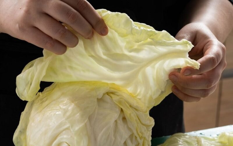 Nupjaukite kopūstus nuo kopūstų. Ant ugnies pastatykite puodą su vandeniu ir užvirinkite. Įberkite druskos ir sudėkite kopūstus. Užvirkite ir patikrinkite, ar lapai jau paruošti.