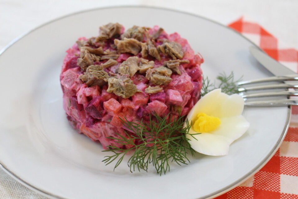 Tai ne vienintelis priedas. Reikia transformuoti padažą. Majonezą ir garstyčias sumaišykite su šaukštu otos. Viskas salotose lieka nepakitę.