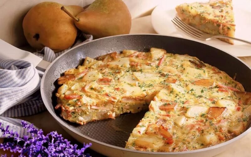 Omletui imkite 6 kiaušinius. Gerai juos suplakite su druska ir pipirais. Omleto bulves supjaustykite apskritimais. Kepkite, kol taps auksinės spalvos. Tada sudėkite bulves į dubenį su kiaušiniais.