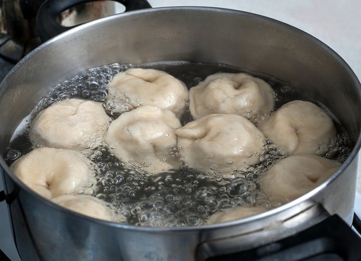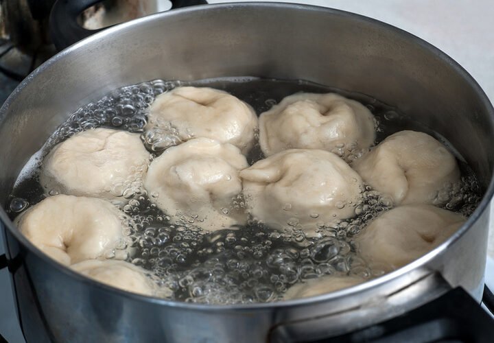 Palaukite, kol sultinys užvirs. Sumažinkite ugnį iki stiprios virimo temperatūros ir uždenkite puodą vikšru. Kai koldūnai išvirs, sudėkite prieskonines žoleles.