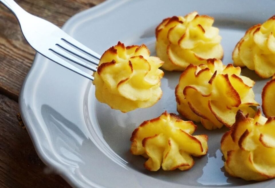 Atskirai sumaišykite džiūvėsius ir kiaušinį. Sudėkite juos į tyrę. Pagardinkite druska ir įberkite dar šiek tiek muskato riešuto. Šaukštu supilkite tyrę į konditerinį maišelį. Ant dekos uždėkite pergamento ir 1 cm arba 1,5 cm antgaliu padarykite 24 bulvių rozetes.